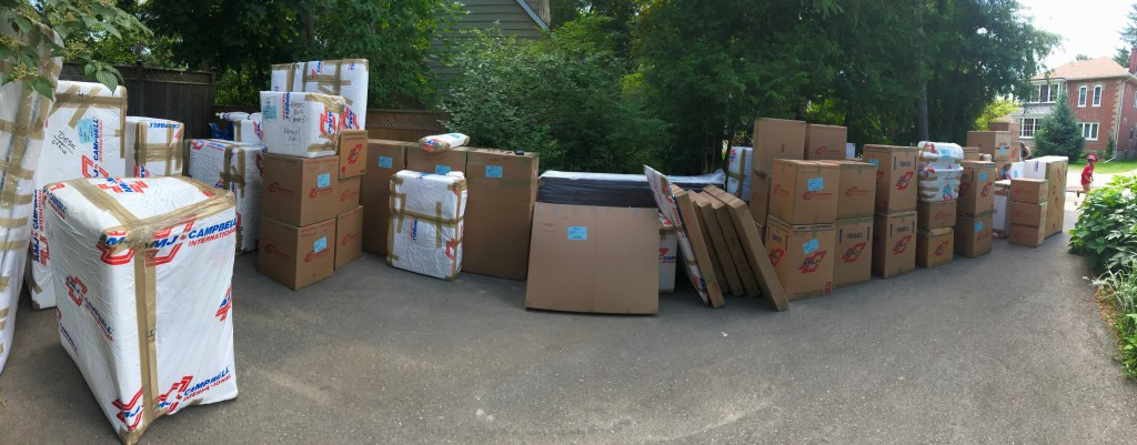 Exhausted but exhilarated by this new week-long experience, we finally boarded our flight back to Toronto. The surprise upgrade to Business Class made the trip much more enjoyable! We spent the next few months preparing for our departure. We sold, gave away or donated items we felt we would no longer need. We filled in even more documentation, including an item-by-item itinerary of all our household goods. I drove to Ottawa for a final one-day orientation with the DND’s staff at the Children’s Education Management office. And our moving dates and flights were finalized. We then booked our temporary accommodations and rental cars in both Orangeville and Mons and waited impatiently for the arrival of our pack and load dates. The packing and loading of our goods were really the least of our work. The moving crew did everything: disassemble, pack, load and ship. We were very lucky. Our work was to stay out of their way.